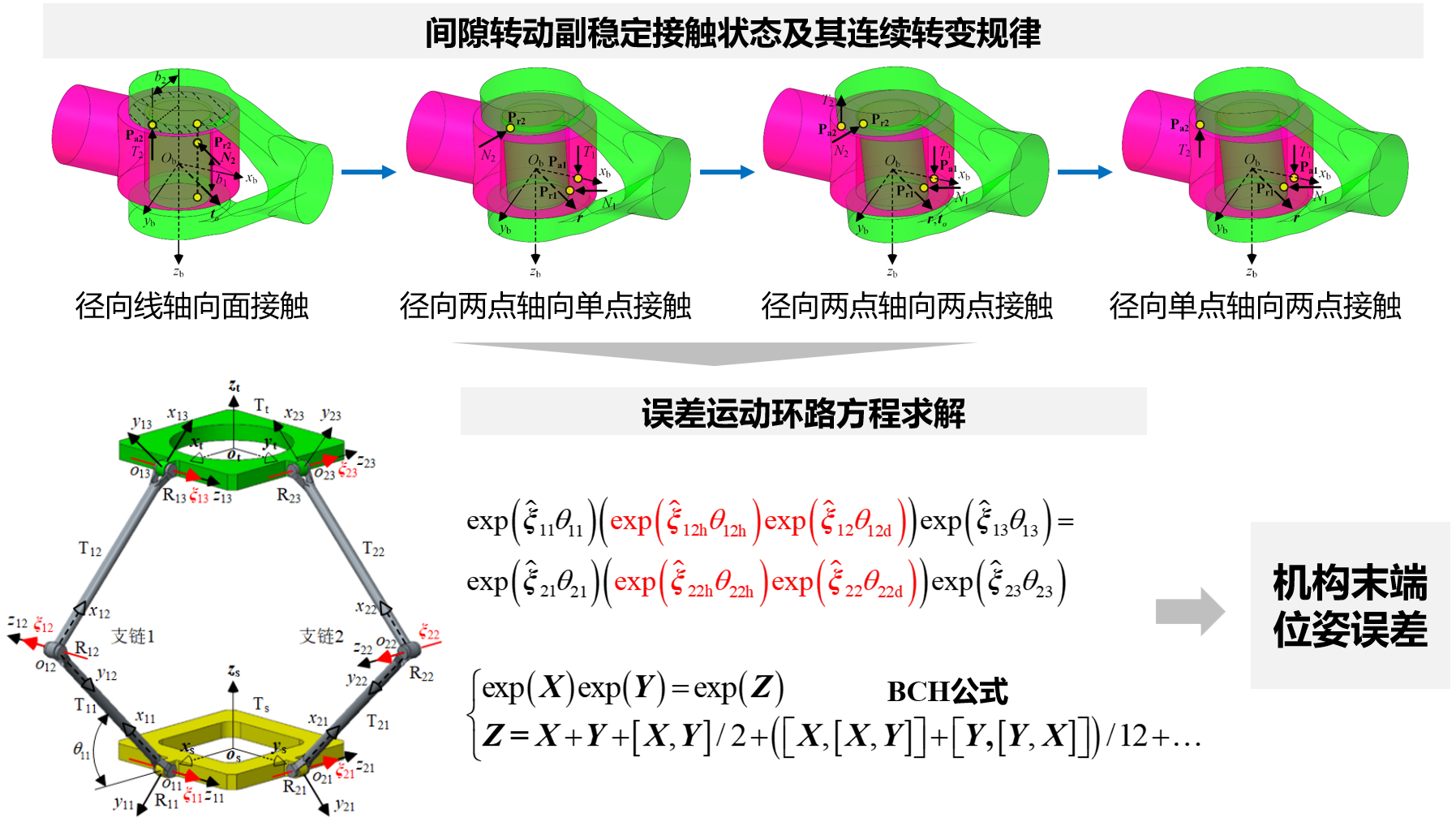 折展機(jī)構(gòu)的桿件是具有一定幾何形狀的非絕對(duì)剛體,其桿件間存在大量運(yùn)動(dòng)副間隙、各環(huán)路之間存在復(fù)雜的耦合約束關(guān)系。研究建立了一種轉(zhuǎn)動(dòng)副空間間隙的等價(jià)機(jī)構(gòu)模型,提出含多源誤差的機(jī)構(gòu)精度調(diào)配方法;揭示了間隙轉(zhuǎn)動(dòng)副穩(wěn)定接觸狀態(tài)間的連續(xù)轉(zhuǎn)變規(guī)律,提出了間隙轉(zhuǎn)動(dòng)副穩(wěn)定接觸的等效運(yùn)動(dòng)分析方法,解決了含間隙轉(zhuǎn)動(dòng)副空間過約束機(jī)構(gòu)在承載時(shí)的精度分析難題。