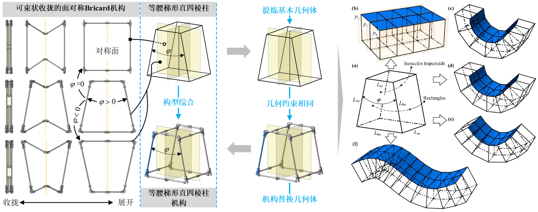 面向特定航天功能形面要求,基于典型機(jī)構(gòu)單元通過特定的組合方式和運(yùn)動(dòng)形式擴(kuò)展創(chuàng)新設(shè)計(jì)了一系列能夠緊湊收攏、具有特定功能形面的折展機(jī)構(gòu):基于同構(gòu)單元周向/軸向組合的套接式折展機(jī)構(gòu)、可準(zhǔn)確擬合給定準(zhǔn)線方程的柱面折展機(jī)構(gòu)、具有連續(xù)光滑表面的圓環(huán)面、拋物柱面折展機(jī)構(gòu)等。